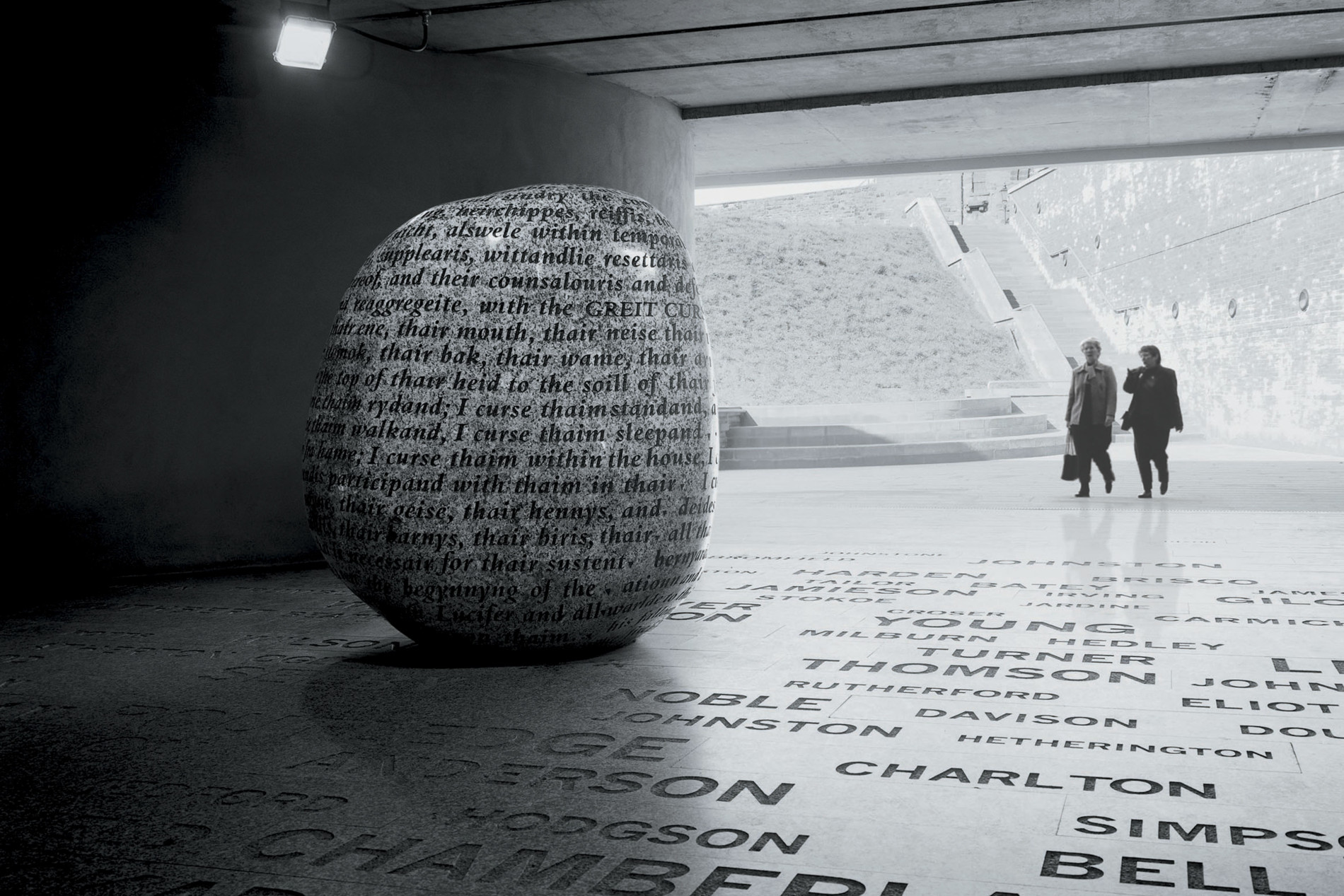 Installed as part of the Millennium Gallery underneath Castle Way, artists Andy Altman and Gordon Young set about creating a very large granite boulder with a mere 383 of the 1,069 word curse written all over it. The stone sits at the end of a pathway detailing the names of all the Reiver families. Gordon himself is a descendant of such families. ‘Reivers’ was the name given to cross border families on the Anglo-Scottish border.